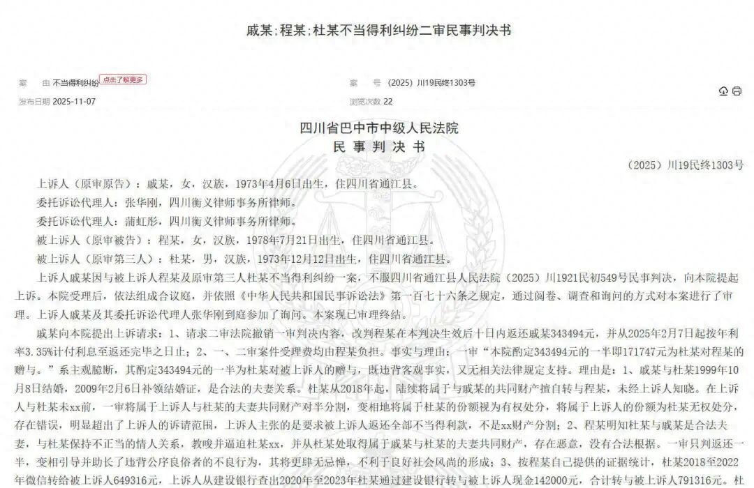 二审法院认为,一审法院适用法律错误,并予以了改判:夫妻共同财产不可擅动:杜某在婚姻期间非因日常生活需要,在妻子戚某不知情的情况下,将大额夫妻共同财产转给程某,行为无效。且杜某与程某之间的婚外情关系,违背了社会公德和家庭美德,以此为基础的赠与行为无效。 程某所称的“经济往来”缺乏充分证据支持,无法证明这些转账是工程款或借款。因此,二审法院撤销一审判决,改判程女士必须全额返还戚女士343494元。来源:都市现场